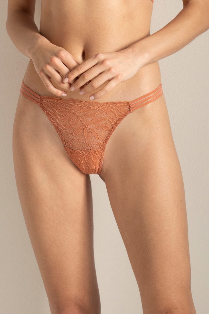 תחתוני תחרה בגזרת חוטיני בצבע טרקוטה (צבע בלתי נראה מתחת לאריגים לבנים!). צידי התחתונים מאוד אלסטיים. מהדורה מוגבלת של Touche