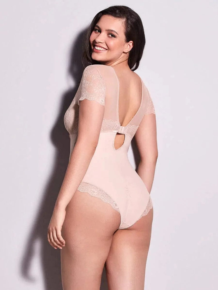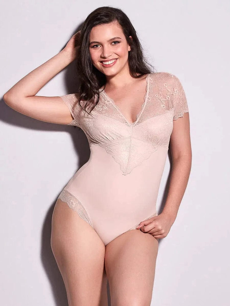 בגד גוף מחטב בשילוב תחרה בצבע גוף-בהיר